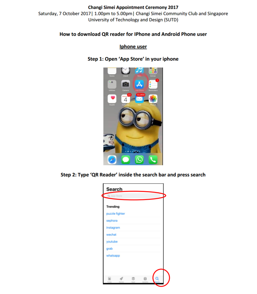 At the Changi Simei Grassroots Organisations Appointment Ceremony on Saturday, 7 October 2017 at the Singapore University of Technology and Design (SUTD), I was informed that registration will be carried out via QR Code. Please ensure you have QR Readers installed in your phones prior to registration.